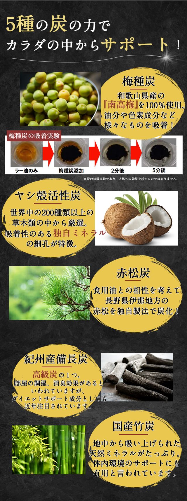 5種類の炭の力で体の中からサポート