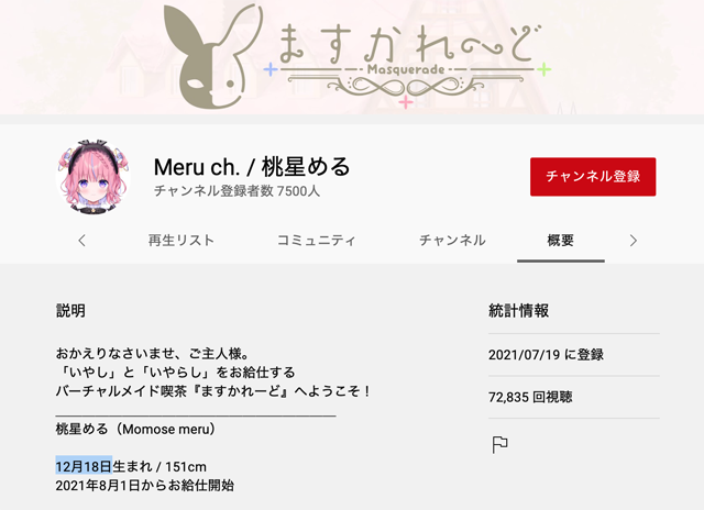 Meru ch. / 桃星めるの所属事務所は「バーチャルメイド喫茶『ますかれーど』」です。
