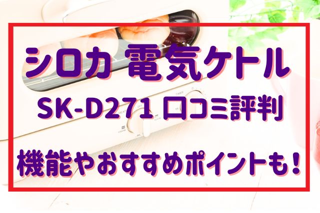 シロカ 電気ケトル SK-D271の口コミ評判を詳しくご紹介します。 電気ケトルを選ぶ際に、こんなお悩みや疑問はありませんか。 沸かすときの音がうるさくないか心配 お手入れが簡単で、毎日ストレスなく使えるか デザインがキッチンに合うかどうか 安全面はしっかりしているか この記事では、こうした悩みや疑問をSK-D271の口コミ評判をもとに分かりやすく解決していきます。 シロカ 電気ケトル SK-D271の主な良い口コミには、 音が静かで朝や夜でも使いやすい 操作がシンプルで迷わず使える お手入れが楽で清潔に保ちやすい デザインがシンプルでキッチンになじむ このあと本文では、SK-D271の悪い口コミや良い口コミ、機能や使い方まで詳しく紹介していきます。 目次 まずは、少数ですが実際の口コミの中で見かけた気になる点をお伝えします。使う人によって感じ方が違う部分なので、購入前にチェックしておきたいポイントです。 「沸騰までの時間が思ったより長いと感じた」 「容量がもう少し大きい方が便利に感じる」 「沸騰までの時間が思ったより長いと感じた」という口コミもありましたが、SK-D271は一度に沸かせる量を効率よく加熱する設計です。大きな電気ケトルに比べると時間がかかると感じる場面もあるかもしれませんが、その分ムダな電力を使わず必要な量だけすばやくお湯を用意できるというメリットがあります。忙しい朝やちょっとした飲み物作りには十分な湯沸かしスピードです。 また、「容量がもう少し大きい方が便利に感じる」という声もありますが、SK-D271は1〜2人分のお湯を沸かすのにちょうどよいサイズ感になっています。大家族で大量のお湯をまとめて沸かしたい場合には別の大容量モデルが向いていますが、普段使いでは必要な湯量だけを短時間で用意できる手軽さが人気です。 このように悪い口コミは少数ですが、感じ方や使い方の違いによって評価が分かれる点になります。自分のライフスタイルに合うかどうかを基準に考えると安心です。 シロカ 電気ケトル SK-D271を実際に使っている人の口コミを見ていると、「使いやすさ」や「暮らしのストレスが減った」といった声がたくさん見られました。ここでは特に多かった良い口コミや評価ポイントを紹介します。 「朝早くてもお湯を沸かしても音が気にならず助かります。」 「夜遅く紅茶を飲むときも静かで家族を起こさず使えました。」 「沸騰音がほとんど気にならないので安心です。」 「静音設計で、休憩時間のお湯沸かしが快適です。」 「子どもが寝ている時でも遠慮なく使えます。」 音が静かだと、忙しい朝や夜でも気兼ねなく使えるのが大きなメリットです。一日のスタートやリラックスタイムに、騒音を気にせずお湯が使えるのは嬉しいポイントですね。 「操作がとてもシンプルで迷わず使えました。」 「電源を入れるだけの簡単仕様で高齢の家族でも使えています。」 「使い方がわかりやすいので初めての電気ケトルにもおすすめです。」 「ボタンがひとつなので、ストレスなく使えます。」 「複雑な機能がなくて気に入っています。」 シンプルな設計は、毎日使うものだからこそ大切なポイントです。取扱説明書を開かなくても直感的に使えるので、忙しい主婦や初めて電気ケトルを使う人にも好評です。 「内側が掃除しやすくていつでも清潔に保てます。」 「カルキも簡単に落とせて手入れが楽です。」 「ふたが大きく開くので洗いやすい。」 「細かい部分がなく掃除がストレスになりません。」 「お手入れが簡単なので毎日使えます。」 面倒なお手入れが簡単だと、毎日使い続けやすいです。忙しい日常でも、サッと洗えていつでも清潔な状態をキープできるのは大きなメリットですね。 以上のように、SK-D271は音の静かさ・簡単な操作・お手入れのしやすさといった日々の生活に寄り添った良い口コミが多く寄せられていました。これらの点は、使い続けるほどにその便利さを実感できるポイントです。 シロカ 電気ケトル SK-D271は、毎日のお湯を沸かす「ちょっとした手間」を減らしてくれる便利な電気ケトルです。忙しい朝や、家事の合間にもサッと使えるのがうれしいところです。 SK-D271は大きすぎず小さすぎない、ちょうど良いサイズ感です。一人暮らしや二人暮らしの家庭では、必要な量だけスピーディーにお湯を沸かせます。キッチンのスペースにも置きやすいので、出しっぱなしにしてもごちゃつかず、毎日の習慣にしやすいですよ。 朝早く家族を起こしたくない時や、夜のリラックスタイムのお茶タイムにも、「音が気にならない」という口コミが目立ちました。SK-D271は煮沸時の音を抑える設計になっていて、静かな暮らしに寄り添う使い心地です。 操作は電源スイッチを入れるだけのわかりやすさ。複雑な設定がなく、子どもや高齢の家族でも迷わず使えます。「何となく取っつきにくい」なんて不安もなく、使い始めてすぐに慣れる操作感です。 内側が広く、フタも大きく開くの